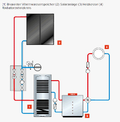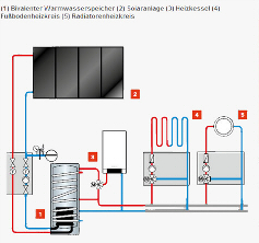 Die abgekühlte Flüssigkeit wird danach wieder in den Kollektor geleitet – der Kreislauf beginnt von neuem. Reicht die Sonneneinstrahlung nicht aus, zum Beispiel im Winter, erfolgt eine Nacherwärmung durch den Heizkessel.